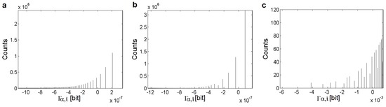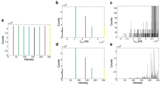For each parameter α, the calculation of helps to find values of the intensities with the identical occurrences and determine their distribution in (a structural part of) the image. Thus, in general, the recalculations to can be considered as Look-Up Tables—intensities with the highest probabilities of occurrences in an image correspond to the highest (positive) values and the brightest intensities in a -transformed image and vice versa. Sometimes, mainly in the case of local information, due to the transformation of the original values into an 8-bit resolution, some levels are merged into one intensity level of the transformed image.