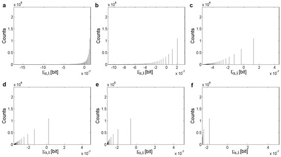 Figure 2 shows distribution changes of the values with the increasing α-parameter. For each parameter α, the elements are enveloped by monotone increasing curves. For instance, as devised in Equation (14), the near linearity of the dependency of the number of elements on the values at α = 2 is seen in Figure 2d. The differences between the distributions are expressed by the distributions of the values along the horizontal axes.