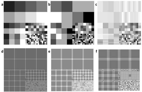 -transformations of the 4.1.07 image [26]. Original image (a) and information images calculated from the whole image (b), a cross around each pixel (c), and circles of the diameter of 5, 17, and 30 px, respectively, with the centered examined pixel (d–f).