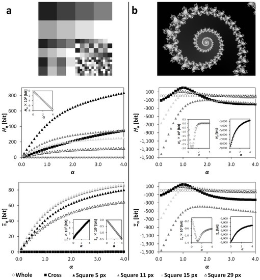 From the point of view of thermodynamics, the and can be considered as additive, homological state variables whose knowledge can be helpful in analysis of multidimensional (image) data as well [32]. Despite the relative familiarity of their formulas (Section 2.3), the can be defined as a sum of all information contributions to the data distribution, either the global or partial one, i.e., all , whereas the is a sum of all information microstates of the distribution. Even in case of the local information, each two (collision) histograms with the same proportional representation of frequencies of elements, which were obtained from distributions around two pixels at different positions and only differing in the positions of frequencies in the histogram, are considered to be unique microstates and produce unique values (see Algorithm 2). Thus, in agreement with the predictions arising from Equations (19) and (20), the -calculation does not suppress contributions of elements with low probabilities of occurrences (rare points) and is more robust and stable against changes in the local surroundings. This phenomenon manifests itself in the lower differences in dependencies (α) for four square surroundings in comparison to the dependencies (α) in Figure 6. Nevertheless, it is worth noting that, during the calculation with the usage of the local geometrical surroundings, the surroundings touch the edges of the image at most and only an interior part of the image is processed. This fact—technical limitation—negatively influences values and for square surroundings in Figure 6 and also leads to the lower sizes of -transformed images (e.g., Figure 3d–f and Figure 5d–f).