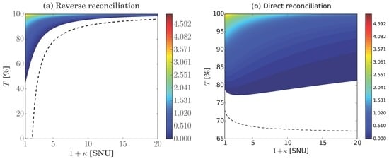 Contour plots of the secure key generation rate for varying preparation noise in shot-noise units (SNUs) and transmission T for (a) reverse reconciliation and (b) direct reconciliation. The error reconciliation efficiency was set to , the modulation variance was 32 SNUs, and the channel excess noise . The dashed lines indicate the minimal possible transmission of a channel where a positive secret key rate can still be obtained, in the ideal case for , no channel excess noise, and in the limit of high modulation variance. (a) For no preparation noise (), the rate decreases asymptotically to zero as the transmission approaches zero. When the preparation noise increases, the security of reverse reconciliation is quickly compromised, to the point where almost unity transmission is required to achieve security. (b) For heterodyne detection and no preparation noise, the rate goes to zero at about transmission, due to the extra unit of vacuum introduced by heterodyne detection. The plot shows the robustness of direct reconciliation to preparation noise.
