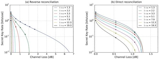 Measured data and theory curves for different levels of preparation noise using (a) reverse reconciliation and (b) direct reconciliation in the post-processing. Error reconciliation efficiency . Due to our simulation of losses (see main text), the error bars on the channel loss are negligibly small, and thus not shown in the figure.
