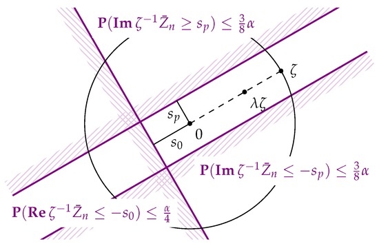 Now, fix ζ and consider , for which may be viewed as the projection of onto the line in the direction of ζ and onto the line perpendicular to it. Both are sequences of independent random variables taking values in with and under the hypothesis. They thus fulfill the conditions for Hoeffding’s inequality with , and or 0, respectively.