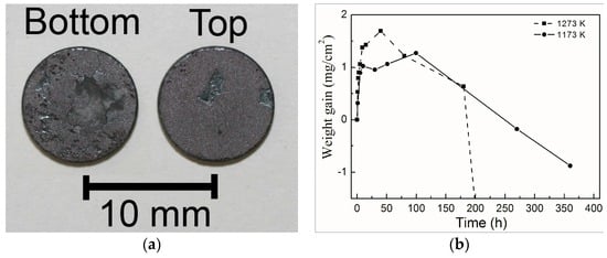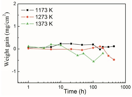 The Al0.2Co1.5CrFeNi1.5Ti0.3 HEA contains aluminum and chromium, and the amount of both is about 21.8 at %. It is well known that it forms alumina and chromium oxide to protect the alloys generally. However, the weight gain of oxidation at 1173 K and 1273 K was shown to be poor in Figure 1. At 1173 K the curve is similar to that found in the previous literature []. That oxidation layer will detach from the substrate and the weight gain decreases after 100 h. Under only 1273 K for 50 h, the layer detaches from the substrate, and the spallation is more serious than that at 1173 K. Figure 1a shows the surface morphology of samples at 1273 K for 180 h. Thus, the weight gains of the present alloys decrease drastically, because the oxide layers are spalled both at the top side or the bottom side.
