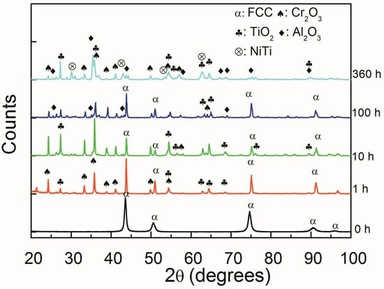 The X-ray curves of the oxidation samples at 1173 K are shown in Figure 2. The Al oxide, Cr oxide and Ti oxide have been identified and detected after 1 h. The precipitation phase of NiTi was formed after 360 h. The intensities of those oxides increase with time. Otherwise, the matrix phase of Al0.2Co1.5CrFeNi1.5Ti0.3 HEA is FCC solid solution, and the peaks are detectable in 100 h. However, those oxide layers are too thick and hide the matrix FCC phase after 360 h.
