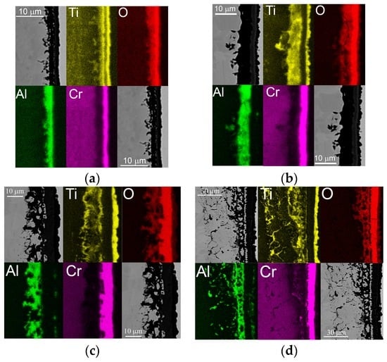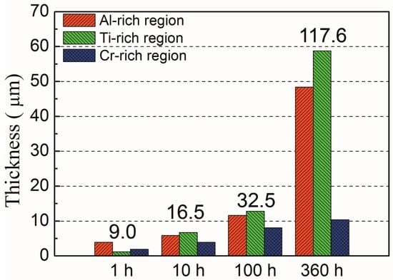 The microstructural evolution of the oxide sample is further observed. The microstructures of oxidation layers at 1173 K are shown in Figure 3. The thin and different oxide layers formed after 1 h, and the oxide layers are Ti oxide, Cr oxide, and Al oxide from the surface in sequence. As it is heating for 10 h, the oxide layer became thicker and grew in the deeper area. The thickness of the Ti oxide layer was almost unchanged at the surface, but it formed an NiTi-rich layer beneath the Cr oxide layer. However, the alumina layer is discontinuous, even lasting for 100 h, so only the Cr oxide layer is insufficient for the alloys to suffer at 1173 K or even a higher temperature. Therefore, the thickness of each oxide layer keeps growing, and the interdiffusion area is over 100 μm in Figure 3d after heating for 360 h. By the EDS mapping results, three regions, the Al-rich, the Ti-rich, and the Cr-rich regions, are compared in Figure 4. The total thickness of the reaction layer is also shown. The oxidation and interdiffusion are both considered. The Cr-rich region is mainly the oxide layer, and it is clearly directed. The thickness is about 10 μm after 360 h. The Al-rich regions are divided into the oxidation area and interdiffusion area. The alumina formed a porous and discontinuous layer, and dispersed close to the surface. Because of the depletion of Al, the NiTi compound phase is formed and that enlarges the Ti-rich region in Figure 3d [].