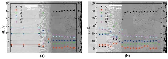 By aluminization, the Al coating is stable and contains Al at about 50 at %. In the interdiffusion zone (IDZ), one region is rich in Co, Ti, and Ni, since they have high mixing enthalpy with Al. As Al just diffuses to the interface during aluminization, the diffusivity of Co, Ti and Ni is promoted. Therefore, the other region, rich in Cr and Fe, is formed followed by the previous region in Figure 6c. However, the Al is continuously diffused and reached a stable concentration with the other elements for a longer time. At the same time, Ti diffused from the matrix into the coating layers and formed the second phase. Its structure and composition need further study. In Figure 5 and Figure 7, the coating layer contains the Al(CoCrFeNiTi) phase and Ti-rich phase. As the alumina forms at the surface at high temperature, the high entropy effect will stabilize the aluminizing layer. By the formation of the coating layer in Figure 6, the reverse reaction can be inferenced. If the dense and continuous alumina were formed at the surface, the IDZ close to the matrix may transform to the matrix phase again at a temperature over 1273 K. At the moment, the concentration of the aluminum is decreased, and the Ti-rich phase will be dissolved again. It is close to the matrix phase of Al0.2Co1.5CrFeNi1.5Ti0.3.