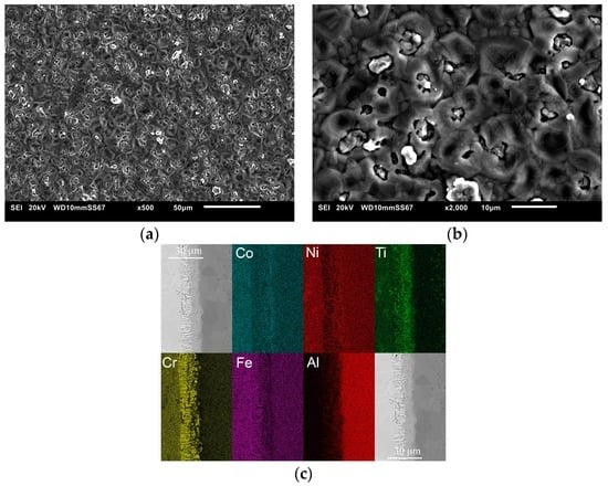 (a,b) The surface morphology after aluminizing coating at 1273 K; (c) the EDS mapping of each element by cross-section.