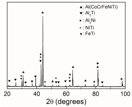 The equiatomic multicomponent AlCoCrFeNiTi high-entropy solid solution alloy has been fabricated by vacuum arc melting and studied on the effect of the aluminum molar ratio. It reveals that only a face-centered cubic crystal structure phase is observed in the CoCrFeNiTi alloy. The phase composition transforms to stabilized body-centered cubic structure phases when Al is added []. The alloy is also synthesized by mechanical alloying with a high-energy planetary ball mill. Two solid solution phases, supersaturated BCC (body center cubic) and FCC (face center cubic), appear when the blended powder is ball milled more than 18 h []. The AlCoCrFeNiTi high-entropy alloy contains more intermetallic compounds after annealing treatment, and there are many compounds, including CoTi2 and FeTi, in CoCrFeNiTi alloy even without aluminum [,]. Above all, it means the aluminum is a strong BCC former. The molar ratio of titanium also needs to be reduced to avoid compounds.
