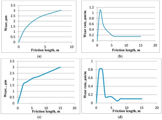 The difference between a gradual and abrupt (self-organization) decrease in the intensity of wear is shown using the example of different types of schematic dependencies of wear and wear rate of the friction distance on Figure 1. Figure 1 shows typical dependencies of wear and the intensity of wear of the friction distance without self-organization (Figure 1a,b) and with self-organization (Figure 1c,d).