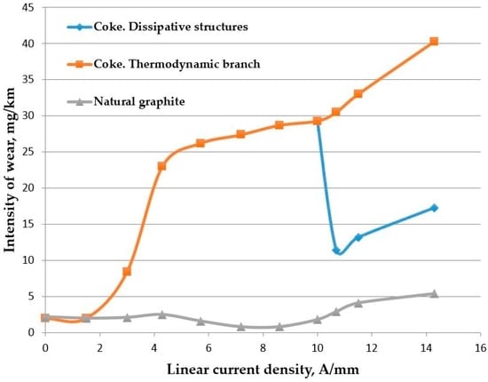 This is why a current collective material based on natural graphite has been manufactured. The dependency of intensity of wear of this material on the density of electric current is shown in Figure 2, which suggests that before the bifurcation point, the intensity of wear of the current collecting material based on charred coal was approximately 30 times higher than the intensity of wear of the current collecting material based on natural graphite. After the bifurcation point this variance can grow and in the case of the formation of dissipative structures it can decrease sharply. It needs to be understood that hardness of the material based on charred coal is twice as high as the hardness of the material based on natural graphite. Thus it has become possible to significantly reduce the integral wear of the current collecting material by shifting self-organization to the relatively softer conditions of friction.