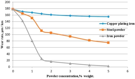 Figure 3 shows dependencies of wear of the copper counterbody at the current density of 10.7 A/mm, which corresponded to the “dissipative structures” of the curve in Figure 2. Figure 3 suggests that the coppered iron powder has little influence on the intensity of wear, the steel powder reduces the intensity of wear by about half, while the iron powder reduces the intensity of wear by at least ten-fold. The wear rate of the collector material behaved similarly. Thus, the use of a catalyst for accelerating the processes with negative entropy production leads to a decrease in wear rate. There are tribosystems in which you need to increase the intensity of wear, for example, when machining parts. It was demonstrated [39] on a purposeful use of a catalyst accelerating the processes of positive entropy production for the grinding of artificial diamonds was demonstrated.