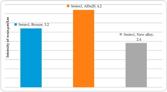 The intensity of wear of the alloys and the steel counter-body has been shown in Figure 4 and Figure 5, respectively. As a result of the complication of alloying, the intensity of wear of the new antifriction alloy has been reduced approximately 1.5 times, while the intensity of wear of the steel counterbody has been reduced approximately six times. Besides, it has been possible to reduce the contents of tin in the aluminum alloy by half. The breaks are marked with abrupt changes in the coefficient of friction on the dependence of the friction coefficient on load of new anti-friction aluminum alloys [41]. The best anti-friction alloy has six sections of reduced friction coefficients corresponding to the time of formation of new secondary structures. The ability of multi-component alloy to adapt to changing frictional conditions is related, in our opinion to high probability of loss of thermodynamic stability in accordance with Equation (2). Therefore, multicomponent alloys have a high ability to self-organize. This results in improved tribological properties in comparison with the alloys with less complex alloying.