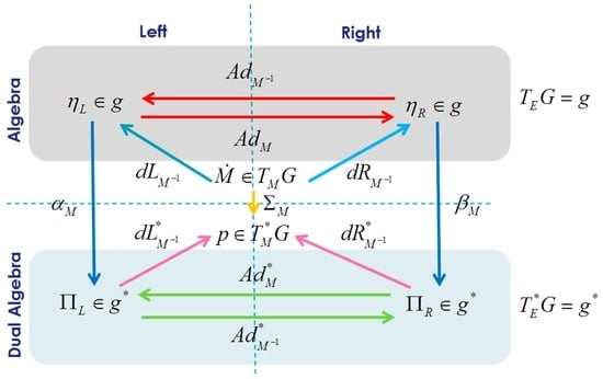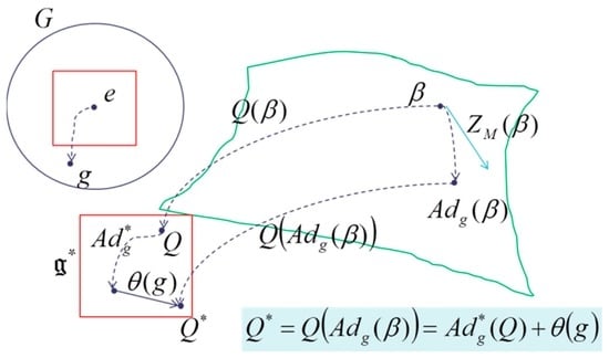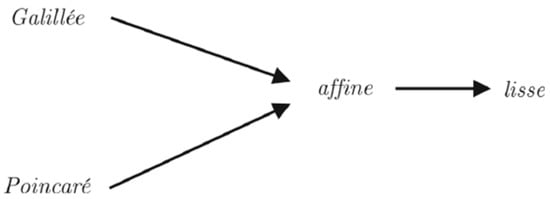 Lagrange’s works on “mécanique analytique (analytic mechanics)” has been interpreted by Jean-Marie Souriau in the framework of differential geometry and has initiated a new discipline called after Souriau, “mécanique géométrique (geometric mechanics)” [,,]. Souriau has observed that the collection of motions of a dynamical system is a manifold with an antisymmetric flat tensor that is a symplectic form where the structure contains all the pertinent information of the state of the system (positions, velocities, forces, etc.). Souriau said: “Ce que Lagrange a vu, que n’a pas vu Laplace, c’était la structure symplectique (What Lagrange saw, that Laplace didn’t see, was the symplectic structure” []. Using the symmetries of a symplectic manifold, Souriau introduced a mapping which he called the “moment map” [,,], which takes its values in a space attached to the group of symmetries (in the dual space of its Lie algebra). He [] called dynamical groups every dimensional group of symplectomorphisms (an isomorphism between symplectic manifolds, a transformation of phase space that is volume-preserving), and introduced Galileo group for classical mechanics and Poincaré group for relativistic mechanics (both are sub-groups of affine group [,]). For instance, a Galileo group could be represented in a matrix form by (with A rotation, b the boost, c space translation and e time translation):