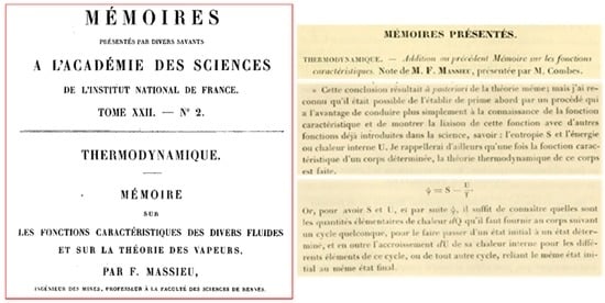 - Balian, R. François Massieu et les Potentiels Thermodynamiques, Évolution des Disciplines et Histoire des Découvertes; Académie des Sciences: Avril, France, 2015. [Google Scholar]