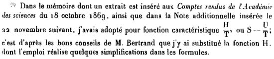Remark of Massieu in 1876 paper [], where he explained why he took into account the “good advice” of Bertrand to replace variable 1/T, used in his initial paper of 1869, by the variable T.