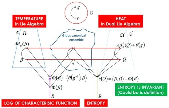 As early as 1966, Souriau applied his theory to statistical mechanics, developed it in the Chapter IV of his book “Structure of Dynamical Systems” [], and elaborated what he called a “Lie group thermodynamics” [,,,,,,,,,,,,]. Using Lagrange’s viewpoint, in Souriau statistical mechanics, a statistical state is a probability measure on the manifold of motions (and no longer in phase space []). Souriau observed that Gibbs equilibrium [] is not covariant with respect to dynamic groups of Physics. To solve this braking of symmetry, Souriau introduced a new “geometric theory of heat” where the equilibrium states are indexed by a parameter with values in the Lie algebra of the group, generalizing the Gibbs equilibrium states, where plays the role of a geometric (Planck) temperature. The invariance with respect to the group, and the fact that the entropy is a convex function of this geometric temperature , imposes very strict, universal conditions (e.g., there exists necessarily a critical temperature beyond which no equilibrium can exist). Souriau observed that the group of time translations of the classical thermodynamics [,] is not a normal subgroup of the Galilei group, proving that if a dynamical system is conservative in an inertial reference frame, it need not be conservative in another. Based on this fact, Souriau generalized the formulation of the Gibbs principle to become compatible with Galileo relativity in classical mechanics and with Poincaré relativity in relativistic mechanics. The maximum entropy principle [,,,,,,,,,] is preserved, and the Gibbs density is given by the density of maximum entropy (among the equilibrium states for which the average value of the energy takes a prescribed value, the Gibbs measures are those which have the largest entropy), but with a new principle “If a dynamical system is invariant under a Lie subgroup G’ of the Galileo group, then the natural equilibria of the system forms the Gibbs ensemble of the dynamical group G’” []. The classical notion of Gibbs canonical ensemble is extended for a homogneous symplectic manifold on which a Lie group (dynamic group) has a symplectic action. When the group is not abelian (non-commutative group), the symmetry is broken, and new “cohomological” relations should be verified in Lie algebra of the group [,,,]. A natural equilibrium state will thus be characterized by an element of the Lie algebra of the Lie group, determining the equilibrium temperature . The entropy , parametrized by the geometric heat (mean of energy , element of the dual Lie algebra) is defined by the Legendre transform [,,,] of the Massieu potential parametrized by ( is the minus logarithm of the partition function ):