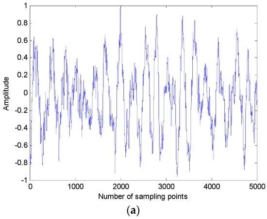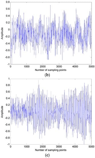 When considering the influence of the length of the time series, three types of the SRN signals are used to analyze PEs with different lengths. The samples are normalized to get the time-domain waveform of three types of SRN signals shown in Figure 1. The sampling frequency is 44.1 kHz, the data length (respectively 1000, 3000, and 5000) selected from Figure 1.