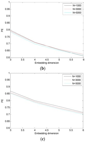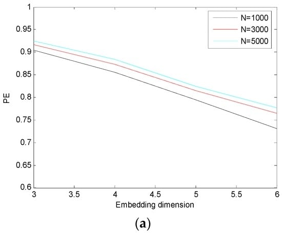 There are three parameters that need to be considered and set during the calculation of the PE, namely, the length of time series N, embedding dimension m and time delay λ. Bandt proposed that embedding dimension m could be take from 3 to 7 [24], if m is 1 or 2, the reconstructed sequence contains too few states, so the algorithm loses its meaning and validity, and also cannot detect the dynamic mutation of time series. Instead, if m is too large, it is not appropriate because the time series are averaged by phase space reconstruction, and cannot reflect the subtle changes in the sequence. Time delay λ has little influence on the time series, so this paper makes λ = 1. In this paper, we will mainly discuss two parameters: the data length and the embedding dimension.