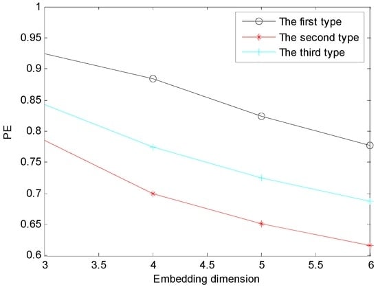 When the series length N is 5000, the influence of the embedding dimension m is studied as a parameter of the PE. The trend of the PEs for the three types of SRN signals can be seen in Figure 3, in agreement with Figure 1, the PEs decrease as the embedding dimension increases. If m is certain, there are some differences in the PEs and the differences are smallest when m is 3. Therefore, we select four as the embedding dimension, which is more discriminating and has a low computational cost.