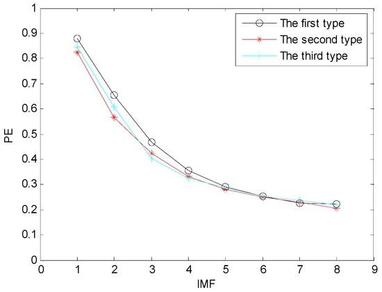 Three types of SRN signals are transformed into IMFs after EMD. Figure 5 shows the PEs of the IMFs. The abscissa is the first to eighth IMF of each type and the ordinate indicates the PEs of the IMFs. As can be seen from Figure 5, the PEs of the IMFs decrease as the order of the IMFs increase, indicating that the higher the order of the IMF, the less complexity. The difference between the PEs in the same level of IMF1 and IMF2 are more obvious than other IMFs, but the difference is small. Their main frequency components are found to be higher than 10,000 Hz after the Fourier Transformation, regarding them as noise IMFs. The PEs of IMF3 to IMF8 at the same level is very similar for three types SRN signals, especially the IMFs of high order. The above analysis shows that the PEs of the same level of IMFs have no obvious difference for the three types of SRN signals.
