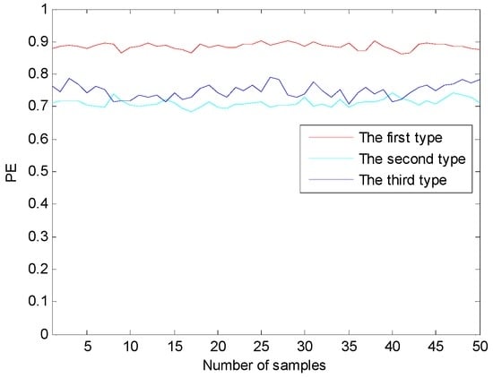 To verify whether the difference is universal for the PE of EIMF, energy difference between high frequency and low frequency, PE and MPE as feature parameters for the three types of SRN signals, 50 out 100 samples for each type of SRN signals are randomly selected to calculate the above four feature parameters respectively. In Figure 8, the abscissa is the number of samples, the ordinate represents the PE of EIMFs. Figure 8 reflects the complexity of the EIMFs, showing that the PEs of EIMFs fluctuate within a certain range, with its value at the same level, but there is a significant difference among the PEs of EIMFs for different types of SRN signals.
