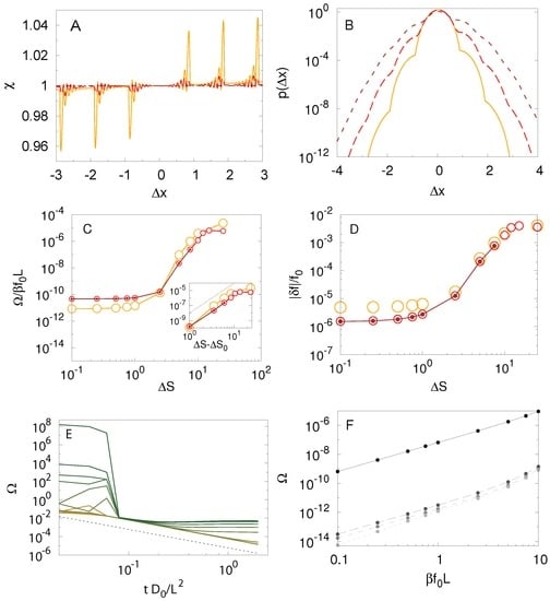 Fluctuation relation for a particle in a constant-amplitude channel and inhomogeneous medium, under a constant force . (A) χ as function of the displacement, , at for different values of the diffusion coefficient modulation: for dotted (brown), dashed (red), and solid (orange) lines, respectively. (B) as a function of for the same parameters as in panel A, where has been calculated using Equation (18). (C) Ω as a function of for with and ; dotted line stands for . (D) as function of for the same parameters as in panel C; dotted line stands for . (E) Ω as a function of time normalized by with , for ; the darker the line, the larger the ratio . (F) Ω as a function of the driving force for .