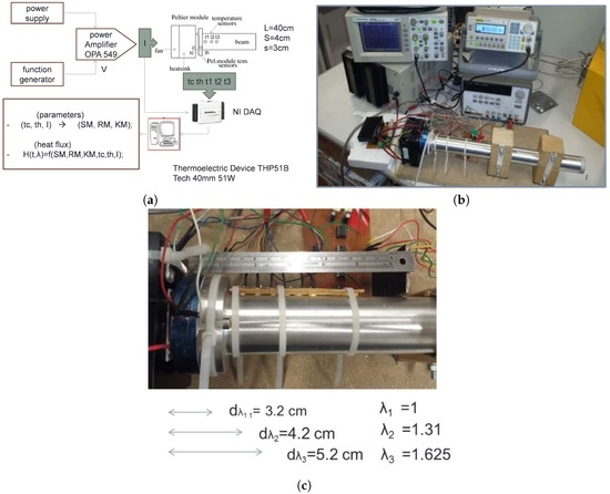 Experimental setup. (a) Schematic, where (V/K) is the Seebeck coefficient, (Ohm) is the Electrical Resistance, and the Thermal Conductance (W/K) of the Peltier cell. Such parameters where calculated using the Ferrotec method (http://www.ferrotec.com) through measurements of the module input current I, the hot side temperature and the cold side temperature . NI DAQ: National Instrument © Data Acquisition Board; (b) Entire acquisition setup; (c) Beam photo with details on the sensors position.
