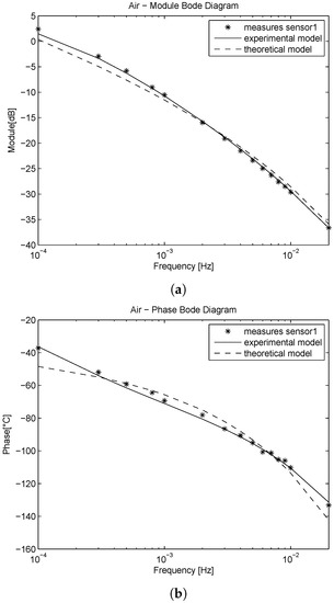 Sinusoidal signals at different frequencies have been used for the model identification in the frequency domain. In particular, input current sinusoids with frequencies , , , , , , , , , , , , , , and were used, causing a heat flux peak-to-peak amplitude of about 45 W. For each frequency, the sinusoidal signal has been applied as a current input, and the temperature measurement was collected on three sinusoids when the steady state condition was reached for the output temperature sinusoid off-set. At the end of each sinusoid measurement, the system temperature was allowed to return to the environmental temperature.
