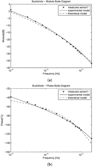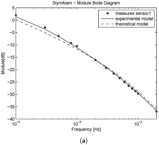 The experimental model’s enhanced performances in fitting experimental data at the location are visible by inspection of the Bode diagrams (see Figure 3, Figure 4 and Figure 5). More evidence of such enhancement is given by the mean square error () calculated between the identified models module and the experimental data at , as shown in Table 3. Moreover, as it is shown in Table 2, the fractional order of the system for the metal buckshots is close to the theoretical value of . The module of the Bode diagram in Figure 5 confirms such evidence, since the theoretical model fits the experimental data with a smaller with respect to the other pipe filling material.
