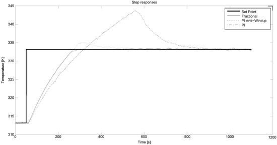 The compared controllers are a conventional PI, an anti-windup PI, and a fractional order (FO) PI controller. The PI has been designed according to the Ziegler–Nichols tuning rules, and the following parameters have been used during the simulation: , ; for the anti-windup controller, see [22]. A feedback gain equal to has been added, while the FO-PI has been designed according to the tuning table given in [23], with , , and the fractional order . In particular, the fractional order controller has been implemented using the Grunwald–Letnikov discrete approximation, as in [1].