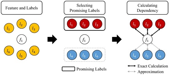 In applications with strict time constraints, the computational efficiency of a multi-label feature selection method is clearly an important issue. However, a high efficiency may not be achieved when the method faces a large label set, because the computational cost for scoring the importance of features increases according to the number of labels [14,17,18]. Thus, when the task involves a large number of labels, the scoring process against L should be economized, to achieve an efficient multi-label feature selection. In this paper, we propose an efficient multi-label feature selection method that can quickly output a feature subset based on a new entropy-based label selection strategy. The proposed method reduces the computational cost of evaluating the feature importance by separating the process into two parts: an exact calculation quantifying the dependency (i.e., importance) between the feature and each label in the promising label set and an approximation of the dependency between the feature and influential labels. Figure 1 presents a schematic of the proposed method with our label selection strategy. For given a feature and six labels (left), the proposed method first identifies a subset of promising labels that would significantly influence the importance of the feature (middle). Finally, as shown in the right figure, the proposed method determines the importance of by calculating the dependency between and promising labels precisely, while approximating the dependency between and the remaining labels.