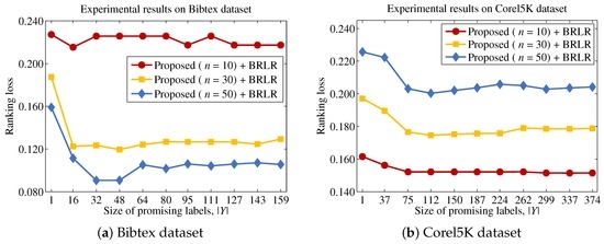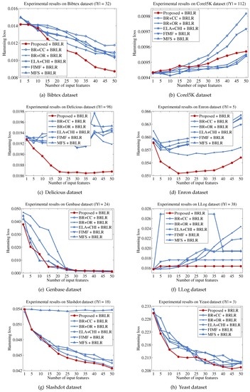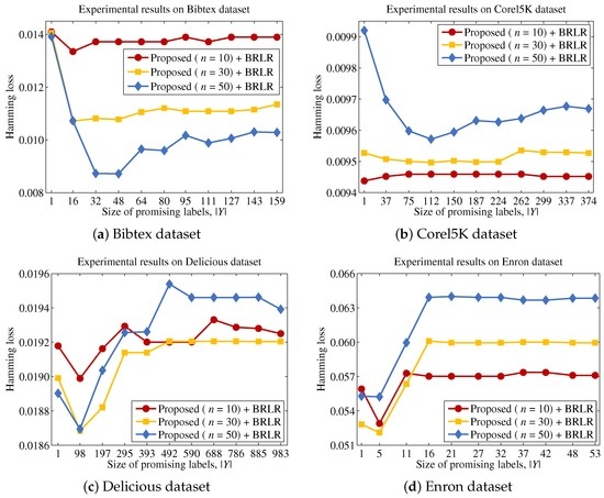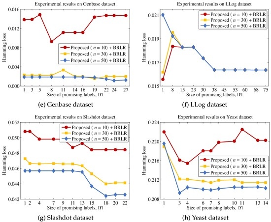 The quality of a feature subset is measured in terms of the multi-label classification performance, based on feature subsets selected by each method. The size of the promising label set is identified by conducting a series of experiments (Section 4.2). We evaluate the performance of each method using the binary relevance-based logistic regressor (BRLR), owing to its strong capability for predicting binary outcomes that form the basis of a label set [55]. In particular, 80% of the randomly chosen patterns from the dataset are used in the training process, and the remaining 20% are used to measure the performance of each feature selection method [18]. Because the multi-label classification performance can differ depending on the number of input features, we measure the classification performance by changing the size from one to 50, with intervals of five features. The experiments were repeated ten times, and the multi-label classification performance is reported according to each evaluation measure. We considered two evaluation measures, which are employed in many multi-label learning studies: Hamming loss and ranking loss [10,18]. Let be a set of test patterns where is a true label set for and is unknown to the multi-label classifier, resulting in and . For each test pattern , a classifier such as BRLR will output a set of confidence values for each label after learning on the training set W. If a confidence value is larger than the predefined threshold value, such as 0.5, then the corresponding label l can be included in the predicted label subset . Based on the ground truth , confidence values and predicted label subset , the multi-label classification performance can be measured according to each evaluation measure. In particular, the Hamming loss is defined as:
