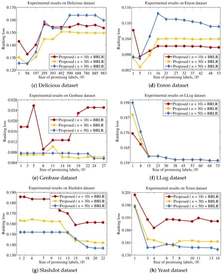 Ranking loss performance of eight datasets according to the size of promising labels while varying the number of input features n. (a) Bibtex dataset; (b) Corel5K dataset; (c) Delicious dataset; (d) Enron dataset; (e) Genbase dataset; (f) LLog dataset; (g) Slashdot dataset; (h) Yeast dataset.