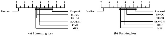 For the Bonferroni–Dunn test, we have at a significance level of , and thus, CD = 2.849 (k = 7, N = 8). Accordingly, the performance between the proposed method and one comparison method is deemed to be statistically similar if their average ranks over all datasets within one CD. To visualize the relative performance of the proposed method and other methods, Figure 6 illustrates the CD diagrams on each evaluation measure, where the average rank of each method is marked along the axis where lower ranks are placed in the right-side [56]. In each subfigure, any comparison method whose average rank is within one CD to that of the proposed method is interconnected with a thick line. Otherwise, any algorithm not connected with the proposed method is considered to have significantly different performance between themselves. The experimental results show that the feature subset selected by the proposed method achieves a significantly better classification performance than the baseline, indicating that the proposed method is able to improve the classification performance. In addition, the feature subset selected by the proposed method gives similar classification performances to those of the compared methods. Because the proposed method consumes lower computational cost than the compared methods, this means the proposed method is able to identify the important feature subset quickly, without degrading the multi-label classification performance.