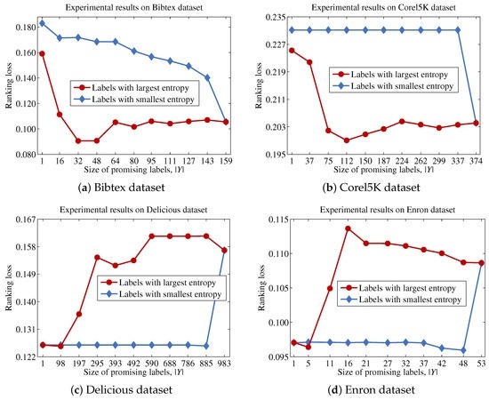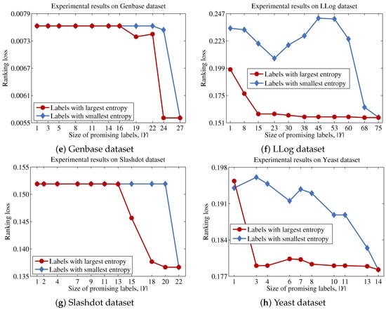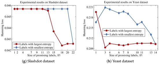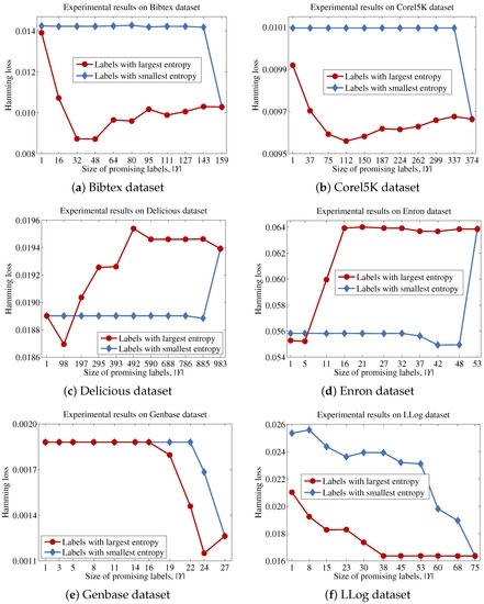 Equation (28) indicates that the uncertainty for a label set can be approximated by the sum of the entropies for each label. Because , the optimal label set Y that maximizes can be obtained by selecting the top labels with the largest entropy values.