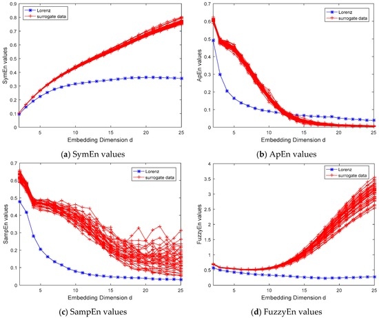 Surrogate data has been widely employed to discriminate the nonlinear dynamics in real data and typical chaotic time series [36,43,44]. The idea of surrogate data is to first specify a stochastic process with some linear properties which are consistent with the original data as a null hypothesis, then generate surrogate data sets according to this hypothesis, and calculate a test statistic for the original data and its surrogate data, respectively. If the statistic value of the original data is obviously different from those of its surrogate data, this null hypothesis is rejected, and nonlinearity is detected. Here, we apply a linear autocorrelated Gaussian noise process as a null hypothesis. This null hypothesis can generate the surrogate data with the same mean, variance, and spectrum power as the original data. The algorithm of this null hypothesis has been detailed in our early work [44]. In this study, the SymEn measure is used as a test statistic, as are the ApEn, SampEn, and FuzzyEn measures. In order to give the degree of difference between the original data and its surrogate data, the z value is given: