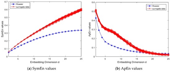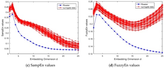 For the noise data from the Gaussian white noise process, we note that its surrogates—which are generated according to the null hypothesis of a linear autocorrelated Gaussian noise process—should give negative results. In other words, the null hypothesis should not be rejected. Figure 2 gives the analysis of the noise time series and its surrogate data on the embedding dimension d = 2:25 for four entropy methods. The results show that the entropy values are different for the different methods (see Figure 2). However, there is no difference between the noise and its surrogate data for the four entropy methods. These results indicate that the null hypothesis is accepted at the 95% confidence level. In other words, the noise data is from the same dynamical process as its surrogates from the null hypothesis. Considering that the dynamical property of the noise is an equiprobable distribution in different embedding dimension d (see Figure 1), its entropy values should increase with the number of the embedding dimension. The symplectic entropy method presents that the SymEn values of the noise and its surrogates increase with the increase of the embedding dimensions (see Figure 2a). However, for the approximate entropy, the values decrease with the increase of the embedding dimensions (see Figure 2b). For the sample entropy, the values vary with the increase of the embedding dimensions, especially no values in the higher dimensions (see Figure 2c). For the fuzzy entropy, with the increase of the dimension, the values decrease a little in the lower dimensions and then increase rapidly in the higher dimensions (see Figure 2d).
