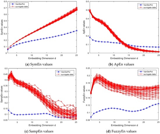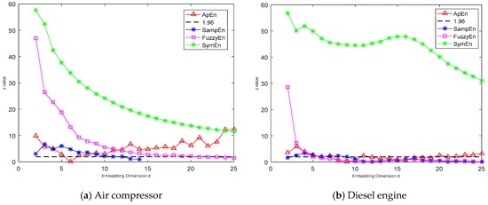 For the sound and vibration signals, we further exhibit the difference degree z values of the discrimination between the original data and its surrogate data in Figure 11. The ApEn, SampEn, and FuzzyEn methods do not achieve all of the difference degrees being larger than 1.96 for all d = 2:25. However, for some embedding dimensions—such as d = 3 or 4—the four methods give consistent discriminations for the sound and vibration signals (Figure 11a,b). The results suggest the rejection of the null hypothesis. For the SymEn method, the performance of the test on the different embedding dimensions is uniform in d = 2:25. The results indicate that the SymEn method is better than the ApEn, SampEn, and FuzzyEn methods.
