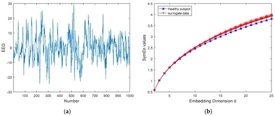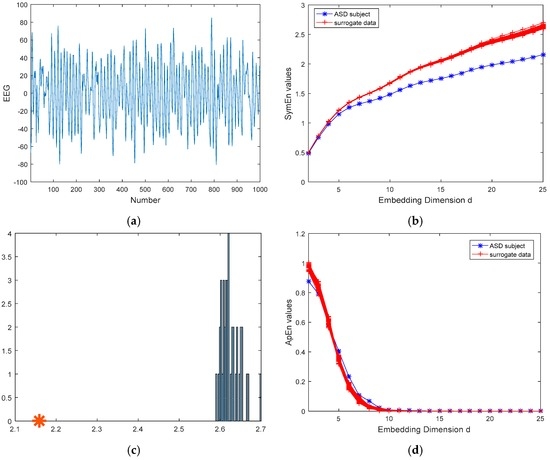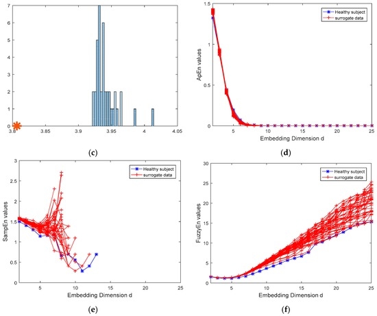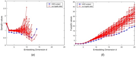For the healthy subject, the results are similar to those of the ASD subject. Figure 7 presents the raw EEG signal as well as the SymEn, ApEn, SampEn, and FuzzyEn measures of the raw data and its surrogates. It can be observed that the SymEn values of the raw data do not belong to the distribution of the SymEn functions of the surrogates (see Figure 7b). Particularly in the dimension d = 25 (z > 1.96), the test of the raw data rejects the hypothesis of belonging to the same distribution as all 39 surrogates (see Figure 7b,c). The result indicates that the raw EEG data contains the nonlinear dynamical properties. The raw EEG data should come from a nonlinear dynamical system. However, the results for the ApEn, SampEn, and FuzzyEn methods are not better than that of the SymEn method (see Figure 7b,d–f).