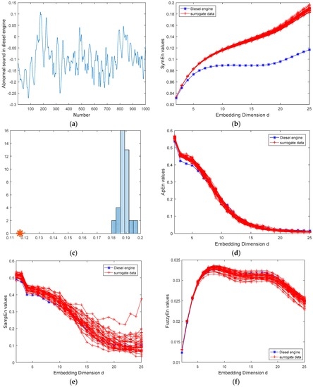 Mechanical systems are also a kind of complex system; for example, diesel engines and air compressors. In engine systems, acoustic signals are often applied to detect the mechanical faults, because they can provide significant dynamic information on the engines [42]. Many acoustic methods are employed to deal with engine faults, such as acoustic emission analysis [47]. However, fault diagnosis based on acoustic signals is often easily affected by background noise [42]. Few studies employ nonlinear analysis methods to explore the characteristics of the abnormal sound in diesel engines. In this paper, we first apply the proposed SymEn function to test the nonlinearity of the abnormal sound of the diesel engine. Figure 8 presents one episode of the original sound data in the faulty diesel engine and its SymEn values with those of its surrogates. Our SymEn-based tests applied to the sound data reject the null hypothesis with 95% confidence over 39 surrogates. In dimension d = 25, the SymEn value of the original data is obviously different from those of its surrogates with the difference degree z = 16.99 (z > 1.96). The results show that the dynamical characteristics of the raw sound data are not linear. The raw data should come from a nonlinear system. Meanwhile, the ApEn, SampEn, and FuzzyEn methods are also employed to analyze the sound data (see Figure 8d–f). In general, the results are worse than that of the SymEn method, although the ApEn values show some difference between the raw data and its surrogate in d = 3,4.