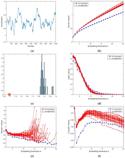 Finally, we examine the vibration acceleration data in an air compressor and its surrogates. Air compressors are extensively employed mechanical systems. The working state of the air compressor becomes unstable due to the interaction of pistons, the pressure instability of the compressed air outputted from the air compressor in volatile gas-consumption situations. Besides, environmental noise often has a strong impact on the vibration measurement. Hence, the measured vibration signals often show complex dynamics behaviors. This paper considers the vibration acceleration collected at the fault state of the air compressor. Figure 9 gives the original series and its SymEn function, as well as those of its surrogate data. The SymEn of the raw data is obviously distinguishable from those of its surrogates. The null hypothesis is rejected at the 95% significance level, especially in d = 25 (z > 1.96). The raw data is not from a linear process in the null hypothesis. The result indicates that the raw data is nonlinear. Besides, the ApEn, SampEn, and FuzzyEn methods are also used to analyze the raw vibration data (see Figure 9d–f). The results of the ApEn, SampEn, and FuzzyEn are worse than those of the SymEn method.