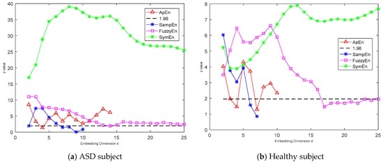 For the nonlinearity test of the EEG signals, previous studies had found that the nonlinear results were varied for the different methods and the EEG at different brain areas [43,48]. Theiler et al. [43] found that the EEG data at the left central (C3) could reject the null hypothesis of a linear stochastic process, whereas any other EEG data (O1) could not. Kugiumtzis also pointed out that cross-examining the results with other methods seemed to be necessary [48]. To examine the practicability of the SymEn function method, the difference degree z values (referring to Equation (15)) are further given in Figure 10 for the four entropy methods to test the EEG signals of the ASD and healthy subjects. For the suitable range of the embedding dimension (such as d = 5), the tests on the EEG signals are consistent for the four entropy methods (Figure 10). For the ApEn, SampEn, and FuzzyEn, variations of the difference degrees are shown with the different embedding dimensions. However, the SymEn method performs better than the other three methods. For the embedding dimension d = 2:25, all the z values of the SymEn function are larger than 1.96. The rejection can be obtained at the wide range of the embedding dimension for the SymEn method. The EEG data can come from a nonlinear brain system. The results are consistent with those in the previous literature [43,48].