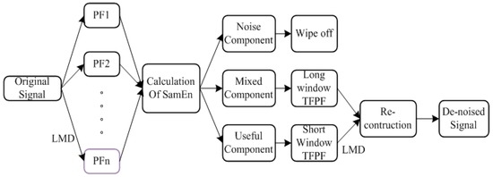 In the design of SE-LMD-TFPF algorithm, there are three components are expected to be obtained, which are named as the useful component, the mixed component, and the noise component, respectively. The useful component is expected to be the pure signal without noise; the mixed component is expected to be the mixed pure signal and pure noise; and the noise component is expected to be the pure noise. Therefore, by preserving the useful component, de-noising the mixed component and removing the noise component, an effective de-noised result can be obtained.