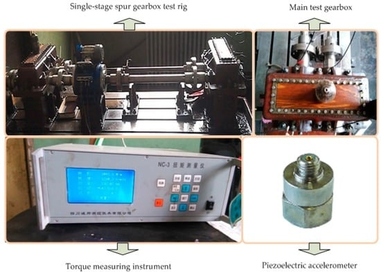 Figure 5 shows the experimental setup for signal acquisition of the gear transmission system. As shown in the figure, the experimental setup mainly consists of a main test gearbox, accompanying test gearbox, accumulator, and torsion bar. The four accumulators are installed on the bearing basis of the driving gear and driven gear. The parameters of the single-stage spur gearbox are as follows: the numbers of driving gear teeth and driven gear are 30 and 45, respectively, the module is 4 mm, the pressure angle 20°, tooth width is 40 mm, and gears are made from 45 steel. The gear ratio of the gearbox is 1:1.5. The torque is set as 408 Nm, the rotation rate is 327 r/min, and the effective power is 13.9 kW. The type of torque measuring instrument is a NC-3 (Chengbang Science and Technology, Chengdu, China). The sampling frequency is 600 Hz. The accelerometer is set on the test-bed, which is comprised of a piezoelectric accelerometer, of the type CA-YD-186 (Sinocera Piezotronics Inc., Yangzhou, China). The axial sensitivity of the CA-YD-186 is 100 mV/g, the frequency range is 0.5–6 kHz and the range of measurement is 50 g.