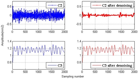 Figure 9 shows the de-noising results of C2 and C3. The original C2 has significant noise; therefore, the long-window TFPF is employed, and we can see that the random noises are suppressed effectively. The original C3 is the component with valid signals; therefore, the short-window TFPF is employed, and we can see that the valid signal amplitude is preserved effectively.