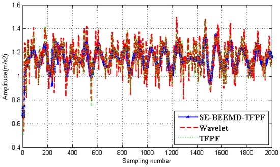 Figure 10 we can see that after wavelet de-noising, the randomness of the signal still exists and it is obvious that the de-noising result of TFPF is better than the wavelet method and the proposed SE-LMD-TFPF can restrain the randomness of the signal effectively. Therefore, it can be concluded that compared to the wavelet method and TFPF algorithm, the proposed SE-LMD-TFPF algorithm has the best de-noising result. The random noises are reduced effectively and the valid signals are preserved.