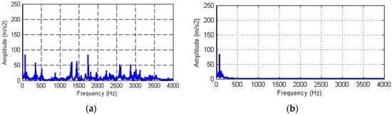 Figure 12 shows the FFT of the original signal and the signal denoised by SE-LMD-TFPF. From