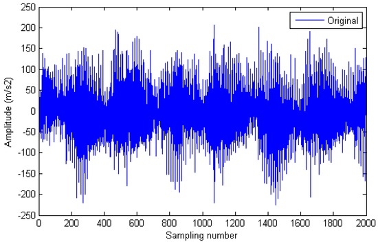 In order to verify the effectiveness of the proposed SE-LMD-TFPF de-noising algorithm, another set of experiments is carried out and the data are employed for verification. In the experiment, the torque is set as 193 Nm, the rotation rate is 1200 r/min, and the power is 24.8 kW.