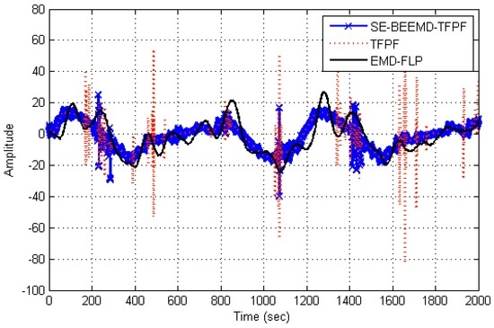 Figure 10. Obviously the de-noising performance of SE-LMD-TFPF is better than TFPF algorithm, but it also can be found that the time cost by TFPF is just 0.76 s and the SE-LMD-TFPF is 2.85 s. Therefore, it can be concluded that, compared to the traditional TFPF method, the proposed SE-LMD-TFPF is more suitable for offline signal processing.